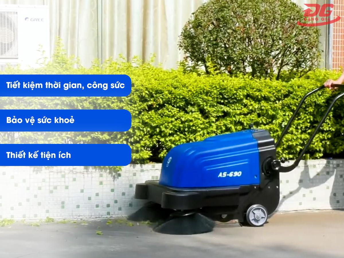Tiết kiệm thời gian, công sức: Máy quét rác tự động được sân trường được trang bị nhiều chổi quét, giúp làm sạch nhanh chóng, tiết kiệm thời gian, công sức và chi phí thuê nhân công.