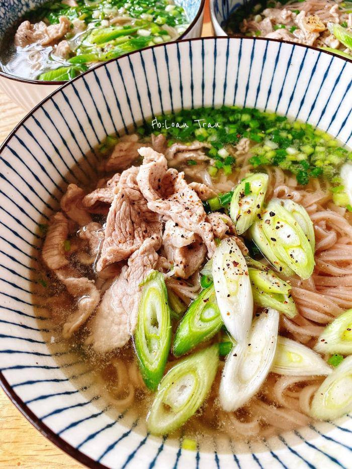 - Bánh phở khô mua về luộc. Món này biến tấu với mì chũ, bánh đa, bún khô đều ngon. Phở luộc chín thì vớt ra, cho vào nồi nước dùng, thêm thịt xào vào, đun sôi một xíu cho thịt chín là xong. Cho phở ra bát, rắc ít hành lá hoặc rau thơm thái nhỏ, ăn nóng.