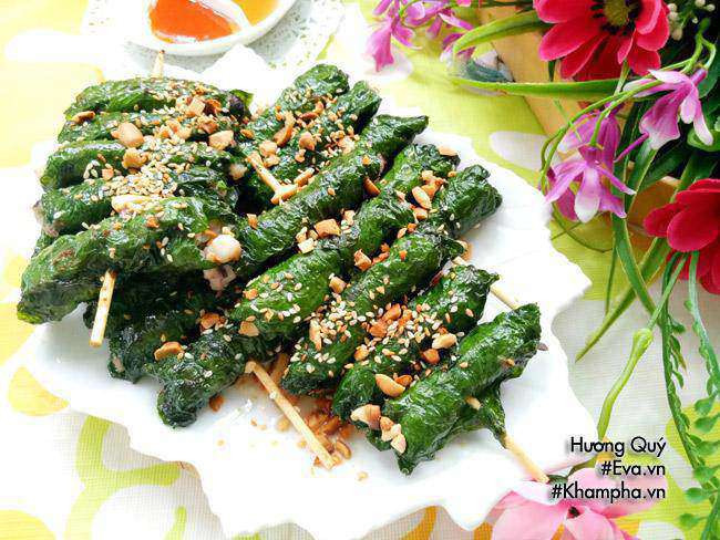 - Trải lá lốt lên đĩa, đặt phần nhân mực vào rồi cuộn tròn lại, dùng que xiên xiên lần lượt từng chiếc chả vào. Làm như vậy cho đến hết nguyên liệu.