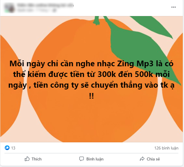 Đối tượng giải thích chỉ cần bật bài hát được yêu cầu trên Zingmp3 thì sẽ được 10 nghìn đồng/bài. Kể cả không nghe mà chỉ bật lên để đó cũng vẫn nhận được tiền.Sau đó sẽ được mời đề nghị kết bạn qua Zalo. Mọi thông tin cá nhân, tài khoản sẽ được nhóm lừa đảo khai thác. Những người hám lợi sẽ dễ dàng bị mắc bẫy.