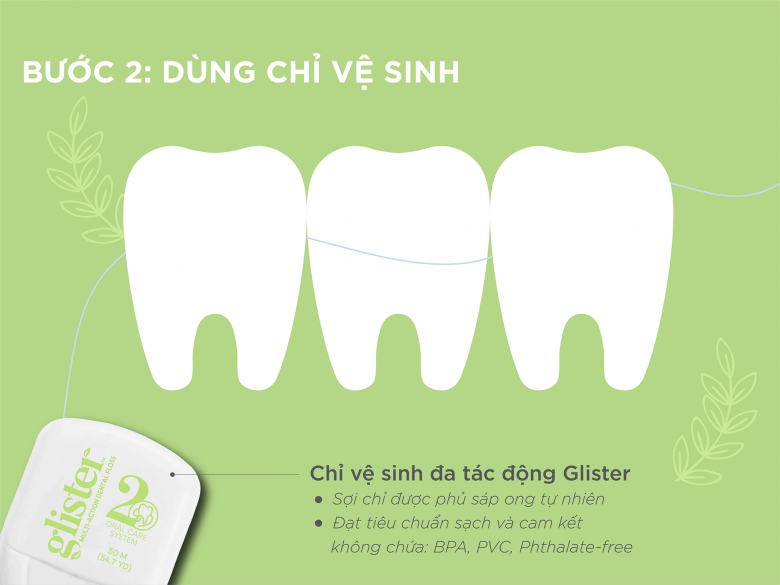 Hạn chế mảng bám với chỉ vệ sinh: Sau khi dùng bữa, thức ăn có thể mắc kẹt trong những kẽ răng hẹp mà bàn chải không thể chạm đến, tạo cơ hội cho vi khuẩn sinh sôi. Vì vậy, để loại bỏ mảng bám và những mầm bệnh trong khoang miệng, bạn có thể dùng chỉ vệ sinh. Trong đó, chỉ vệ sinh Glister có dạng dẹt nên dễ dàng làm sạch kẽ răng. Không những thế, sợi chỉ được bọc một lớp sáp ong để di chuyển nhẹ nhàng và không tổn hại đến nướu cũng như hệ vi sinh khoang miệng.