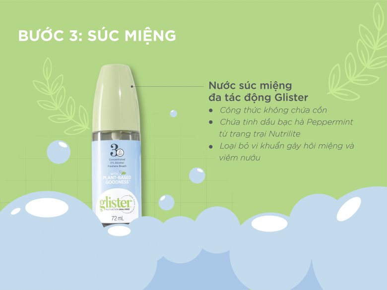 Súc miệng để miệng sạch trọn vẹn: Sau khi làm sạch, bước súc miệng rất quan trọng để lọc những mảng bám còn sót lại, ngăn vi khuẩn có hại làm mất cân bằng hệ vi sinh khoang miệng. Nước súc miệng Glister không chứa cồn, có lô hội và tinh dầu bạc hà từ trang trại Nutrilite giúp loại bỏ vi khuẩn gây hôi miệng, mang đến cảm giác sạch và hơi thở thơm mát. Đặc biệt, nước súc miệng không làm ảnh hưởng đến vị giác, bạn có thể tiếp tục tận hưởng cuộc sống một cách sảng khoái. Sản phẩm được khuyến nghị sử dụng 2 lần mỗi ngày.