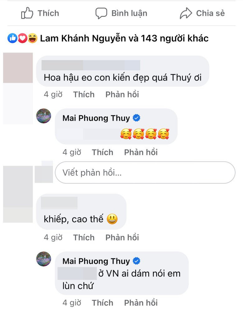 Một người hâm mộ còn choáng váng vì chiều cao của Mai Phương Thuỳ ở đời thực, nàng hậu bất ngờ đáp lời: “Ở Việt Nam ai dám nói em lùn chứ".