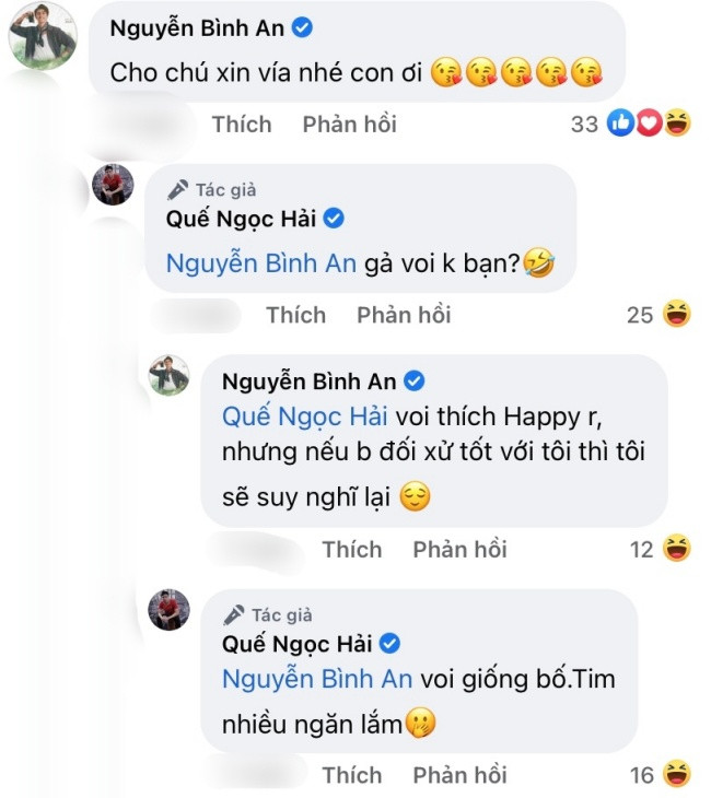 Tiếp đó, khi cầu thủ Quế Ngọc Hải khoe ảnh con gái xinh xắn, Bình An ngay lập tức vào "xin vía" cho gia đình. Nam cầu thủ sinh năm 1993 liền ngỏ ý muốn làm thông gia với Khôi trong Đừng Làm Mẹ Cáu: "Gả Voi không bạn?". Bình An liền đáp: "Voi thích Happy rồi nhưng nếu bạn đối xử tốt với tôi thì tôi sẽ suy nghĩ lại". Khá bất ngờ, Quế Ngọc Hải liền "cà khịa": "Voi giống bố, tim nhiều ngăn lắm".