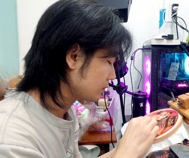 Hàng ngày, trong căn phòng nhỏ, Nhật Khiêm cặm cụi bên khung thêu gỗ, đôi tay khéo léo luồn từng sợi chỉ qua lớp vải, tạo nên những tác phẩm sinh động, bắt mắt. Nhìn những bức tranh thêu tả thực, phong cảnh đầy màu sắc trong căn phòng nhỏ, ít ai ngờ rằng người tạo ra chúng là một chàng trai trẻ từng làm văn phòng, shipper và đóng gói hàng hóa.