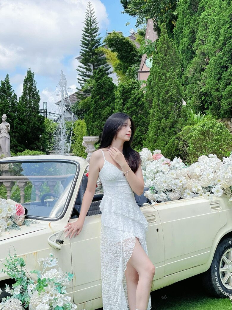 Trong một outfit khác, Bảo Chinh hóa nàng thơ với thiết kế đầm ren ngắn cùng lối trang điểm nhẹ nhàng, tự nhiên, tạo nên tổng thể có phần nhẹ nhàng, mong manh