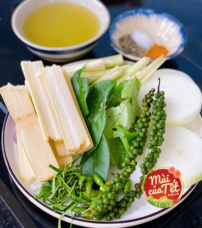 - Hành tây bóc vỏ, rửa sạch, bổ miếng. Sả bóc vỏ già, đập đập. Lá chanh rửa sạch. Ớt xiêm và tiêu xanh rửa sạch.
