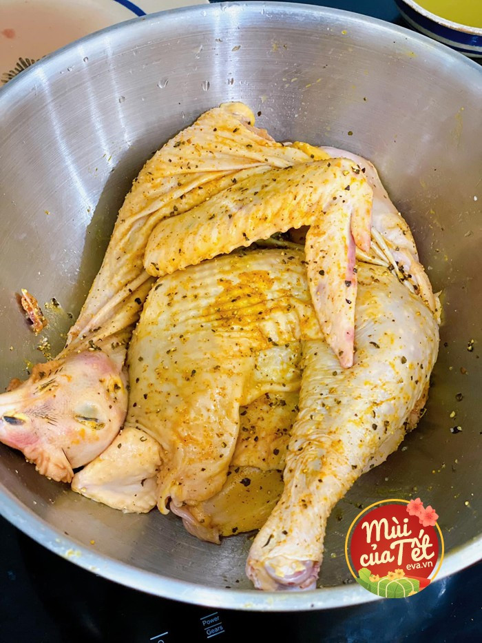 - Gà mổ sau đó làm và rửa sạch. Sau đó đem gàu ướp với một ít muối, hạt tiêu xay và bột nghệ vừa đủ.