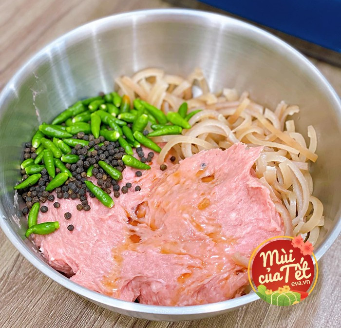 Đem trộn bì heo với giò sống, nước mắm, tiêu sọ, ớt xiêm xanh, nước mắm sao cho thật đều.
