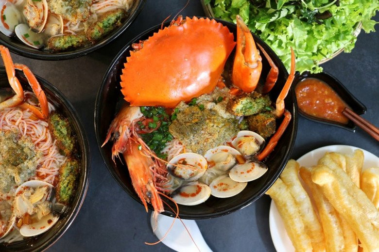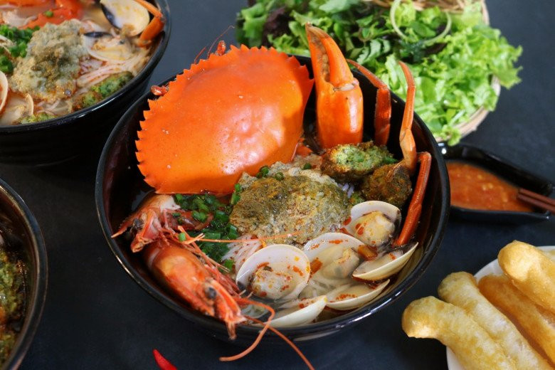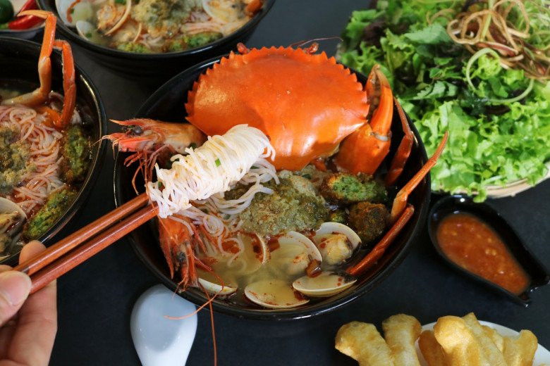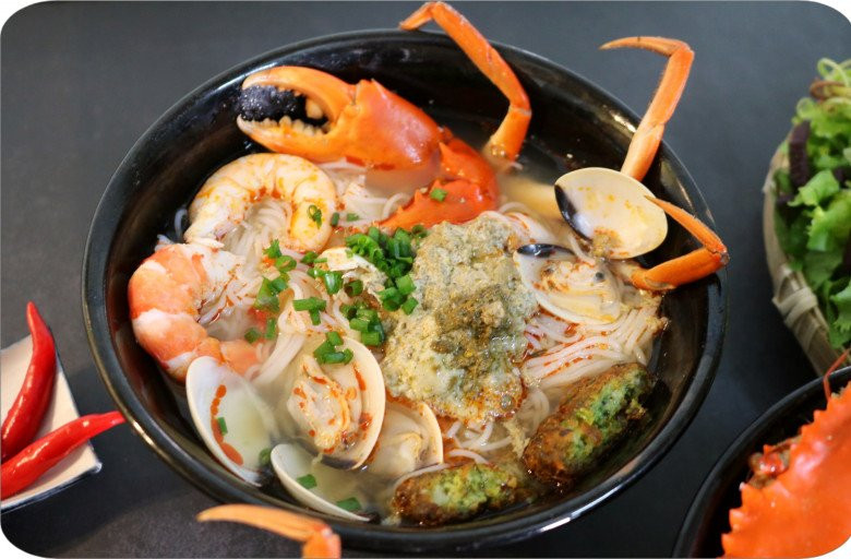 Chần sơ bún rồi xếp vào bát, thêm tôm, cua và mực hấp rồi chan nước dùng có nấm, đậu phụ, cà chua lên trên.