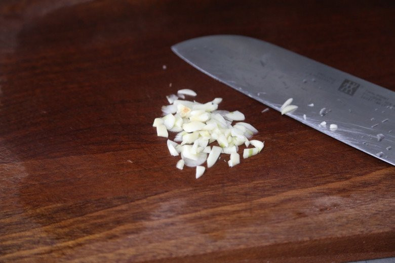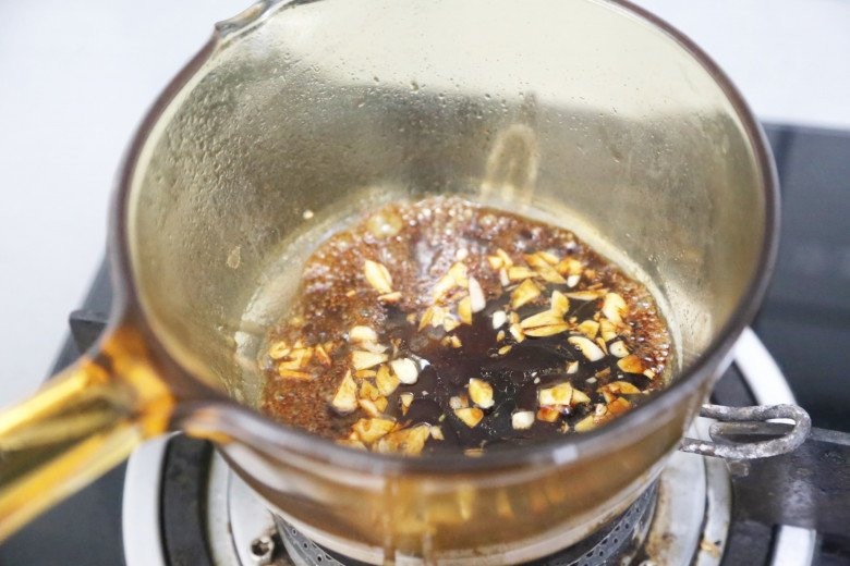 Đun nóng dầu ăn trong chảo, cho tỏi băm vào phi thơm. Sau đó cho nước tương, dầu hào vào xào cho có mùi thơm.