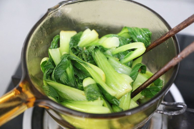 Cuối cùng cho cải chíp vào, đảo đều để rau ngấm gia vị là tắt bếp.