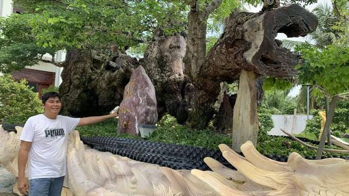Anh Phong tình cờ sở hữu cây me keo trong một lần đi xa. Lúc mới đem về, cây chỉ là một thân gỗ bình thường, không có gì nổi bật. Tuy nhiên, sau quá trình chăm sóc và đặt vào chậu phù hợp, cây phát triển tốt. Gốc cây xù xì mang dáng vẻ giống một con lân, trong khi các tán lá phía trên xòe rộng, xanh mướt và bắt mắt.