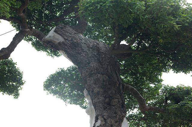 Từ xa nhìn lại, cây mang dáng vẻ vững chãi với tán lá bồng bềnh, xanh mát, thế cây ấn tượng khiến nhiều người không khỏi trầm trồ. Phần thân cây nổi bật với những đường nét lũa tự nhiên, sần sùi, tạo vẻ đẹp cổ kính và mạnh mẽ.