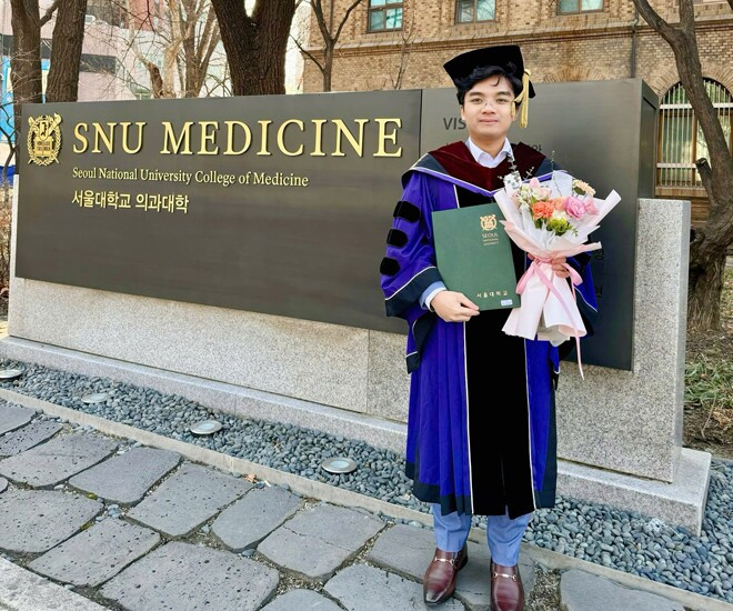 Trong một năm học Thạc sĩ, mặc dù được tiếp thu nhiều kiến thức mới nhưng vẫn không khiến Thế Vinh thỏa mãn. Thế nên trong những tháng cuối theo học Thạc sĩ, Vinh chuẩn bị đề cương nghiên cứu ứng dụng lâm sàng tế bào gốc trung mô từ mô mỡ trong thẩm mỹ, da liễu cho bậc học Tiến sĩ. Với đề cương này, 9X được nhận vào làm nghiên cứu sinh tại Đại học Quốc gia Seoul (Hàn Quốc) trước khi nhận bằng Thạc sĩ.