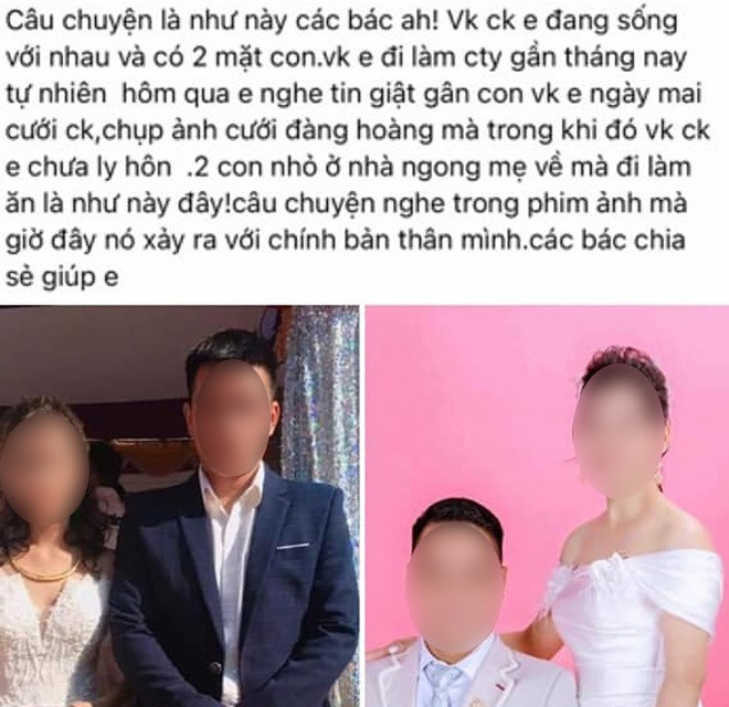 Mới đây (18/12), mạng xã hội lan truyền câu chuyện chồng tố vợ đi làm công ty được gần một tháng thì bất ngờ chụp ảnh cưới với người đàn ông khác gây xôn xao. Theo đó, anh Đ.N ở Sơn La bức xúc chia sẻ trên trang cá nhân: “Câu chuyện là như này các bác à! Vợ chồng em đang sống với nhau và có hai mặt con. Vợ em đi làm công ty gần tháng nay, tự nhiên hôm qua em nghe tin giật gân: Vợ em ngày mai cưới chồng, chụp ảnh cưới đàng hoàng. Trong khi đó vợ chồng em chưa ly hôn, hai con nhỏ ở nhà ngóng mẹ về mà đi làm ăn là như này đây.