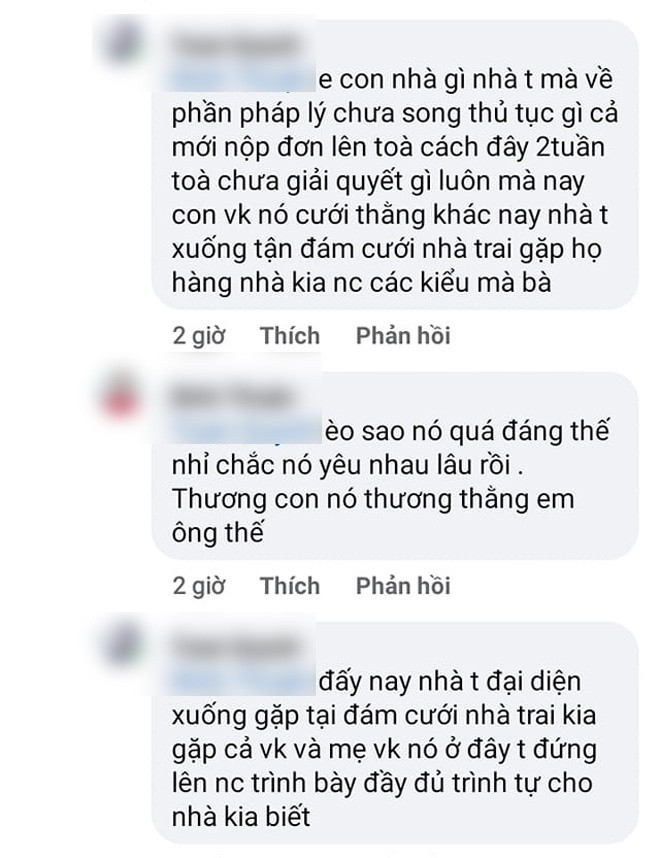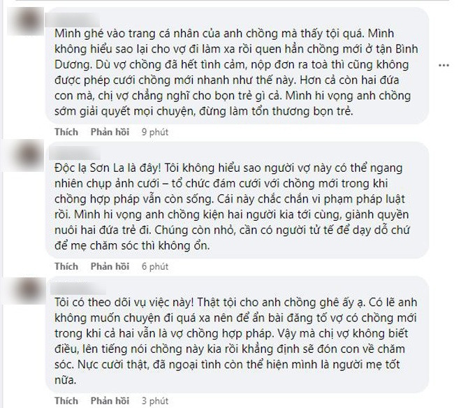 Tài khoản N.V bức xúc: “Mình ghé vào trang cá nhân của anh chồng mà thấy tội quá. Mình không hiểu sao lại cho vợ đi làm xa rồi quen hẳn chồng mới ở tận Bình Dương. Dù vợ chồng đã hết tình cảm, nộp đơn ra toà thì cũng không được phép cưới chồng mới nhanh như thế này. Hơn cả còn hai đứa con mà, chị vợ chẳng nghĩ cho bọn trẻ gì cả. Mình hi vọng anh chồng sớm giải quyết mọi chuyện, đừng làm tổn thương bọn trẻ”.