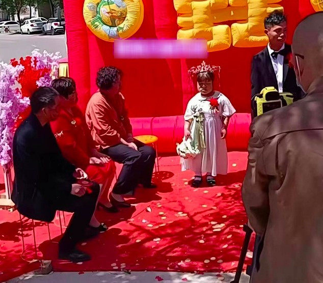Nhưng ngày cưới đến, tại hôn trường, khuôn mặt chú rể vẫn đầy vẻ bất đắc dĩ. Vì cô dâu chỉ cao 1 mét và không ưa nhìn lắm nên chú rể không mấy quan tâm. Thậm chí, anh còn quay mặt sang một bên, không muốn phải nhìn thấy cô dâu của mình.