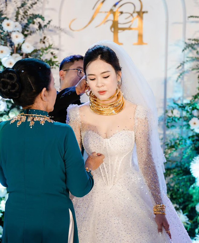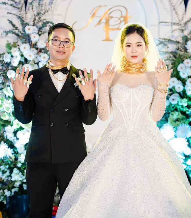 Cô dâu sở hữu nhan sắc xinh đẹp và dịu dàng đeo chi chít vàng ở cổ, cổ tay và ngón tay. Còn chú rể đeo gần chục chiếc kiềng vàng trên cổ, ngón tay cũng ngập vàng.