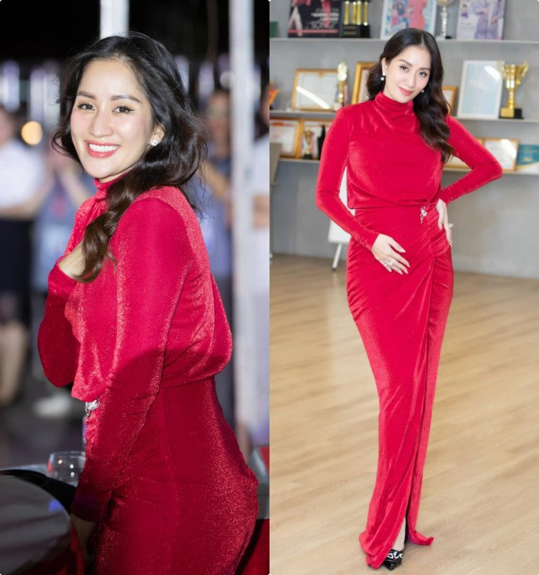 Bà bầu Khánh Thi quyến rũ "cháy máy" trong 1 thiết kế dây rút xẻ tà. Cô ưu ái cách trang điểm nhẹ nhàng, tinh giản. Mái tóc của cô giáo khiêu vũ cũng thường được uốn xoăn lơi nhẹ nhàng để tôn lên nét thanh thoát cho gương mặt.