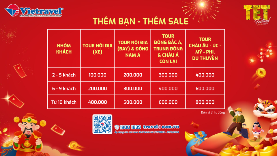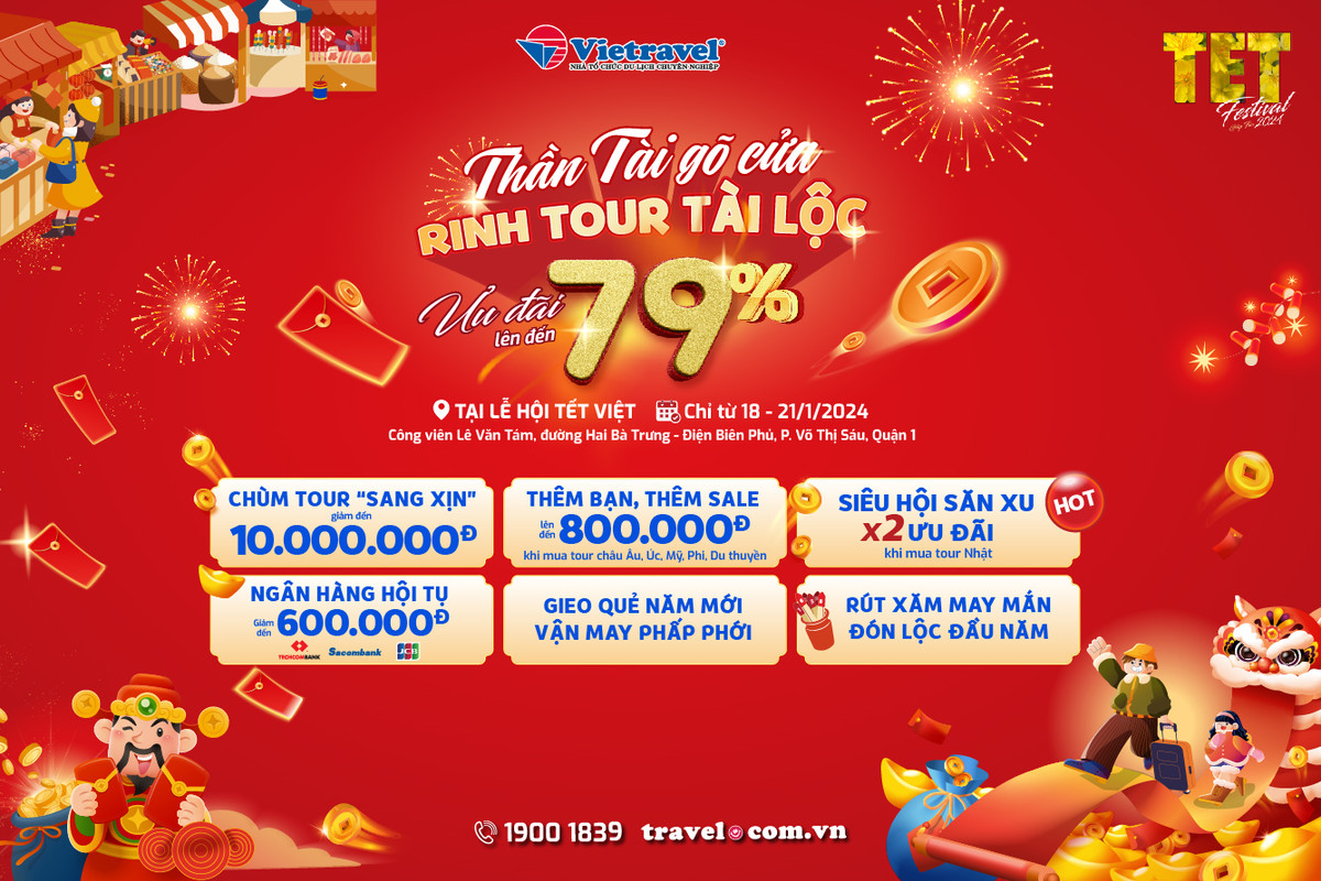 Với những nét văn hóa đặc sắc trên, trong 04 ngày diễn ra sự kiện Lễ hội Tết Việt 2024, Vietravel gửi đến quý khách hàng chiếc deal siêu xịn mang thông điệp nghinh đón “Thần Tài” rinh tour giá sốc với mức giảm giá đến 79% (các tour Thái Lan, Trung Quốc… chỉ còn gần 3.000.000 đồng). Không chỉ giúp du khách tối ưu hóa chi phí du lịch trong dịp Tết và Hè 2024, mà bộ sản phẩm giá tốt (giảm đến 10.000.000 đồng) còn là cơ hội tuyệt vời để trải nghiệm văn hóa độc đáo tại các điểm đến thuộc khu vực châu Á, châu Âu, châu Mỹ và siêu du thuyền sang trọng bậc nhất thế giới.