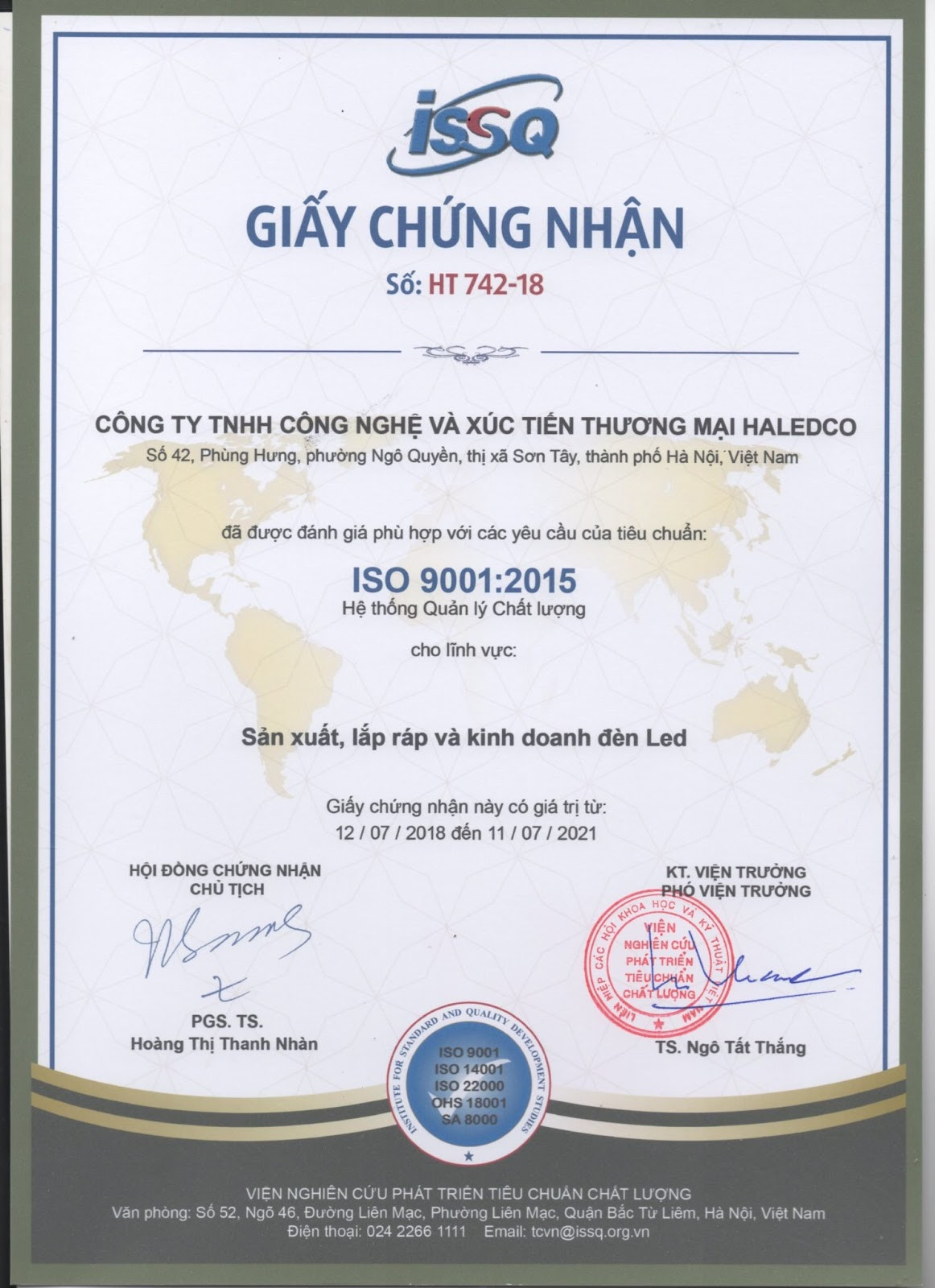 - Chứng nhận ISO 9001:2015 về sản xuất, lắp ráp và kinh doanh đèn LED