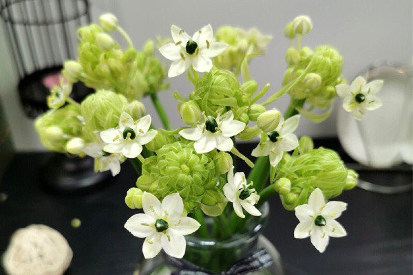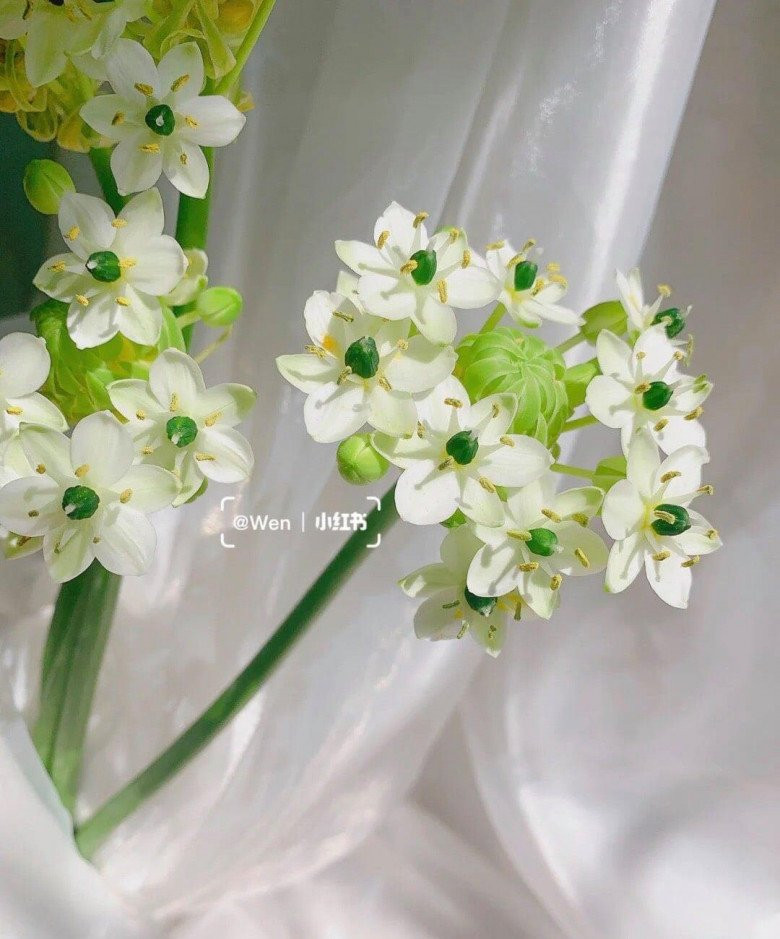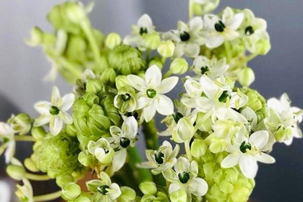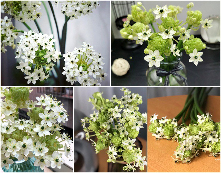 Hoa khi chưa nở thì có búp hoa dày và xanh như ngồng tỏi, cắm lọ trông rất cá tính. Hoa khi mới nở sẽ nở từ dưới lên, giống như thiên nga đang xoè cánh. Đến khi hoa nở căng thì mang vẻ đẹp kiêu sa, dáng tròn như tú cầu, để lộ nhụy hoa xanh biếc và 6 nhị vàng.