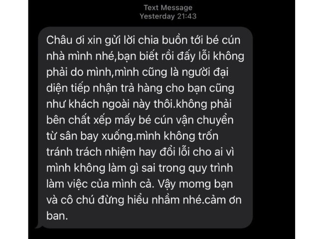 Đến 20h30 cùng ngày, Châu Bùi và chị gái đều không có thêm bất kỳ phản hồi nào từ phía dịch vụ vận chuyển. Đến đêm, phía vận chuyển mới gửi tin nhắn nói rằng họ đã "làm đúng trách nhiệm".
