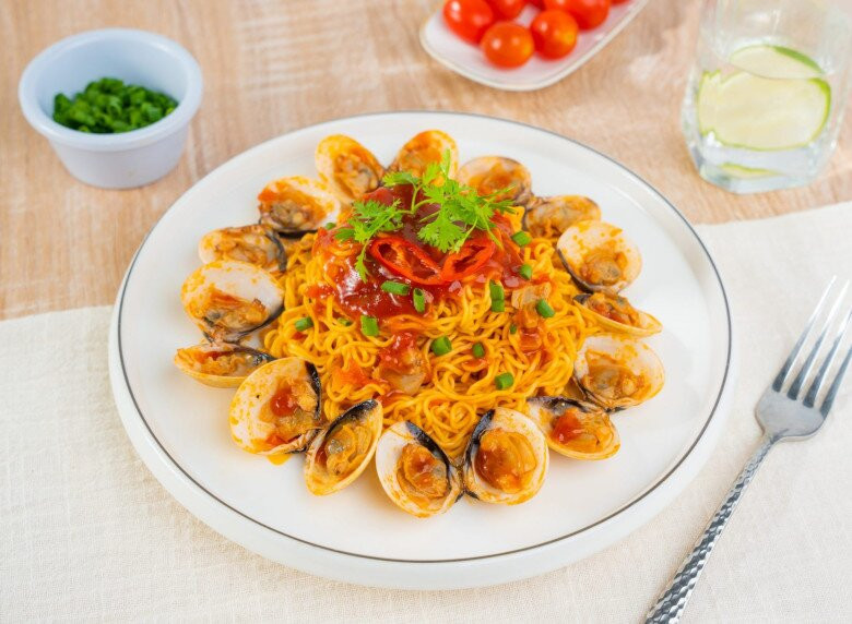 Xào nghêu: phi thơm đầu hành, cho nghêu xào trên lửa lớn (2 phút), thêm xốt cà chua, gói xúp bột, gói xúp sệt vào trộn đều.
