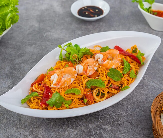 Thưởng thức: Cho tôm và rau thơm, cà chua lên mặt mì, dùng nguội, trộn đều khi ăn.