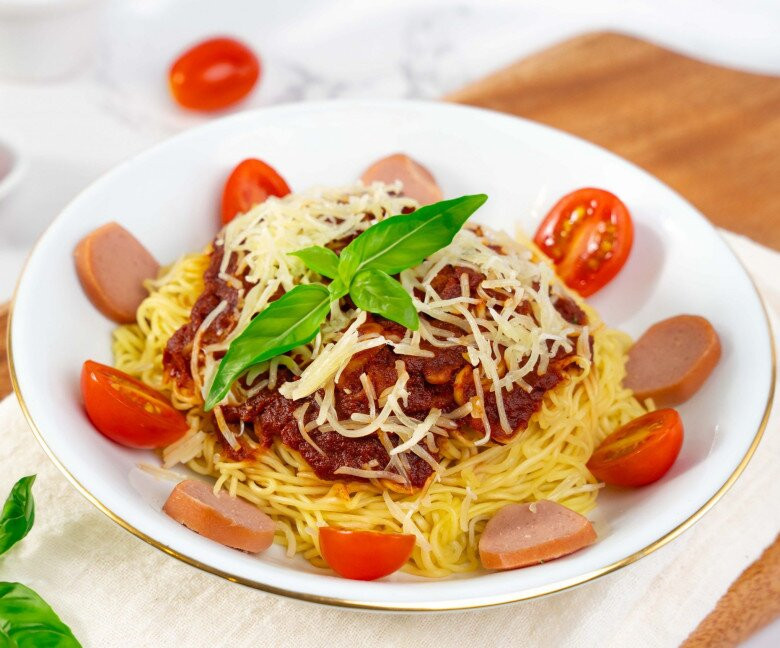 Thưởng thức: Cho mì ra dĩa, tiếp hỗn hợp sốt cà chua, thêm phô mai sợi, rắc lá quế tây lên trên. Trộn đều khi ăn.