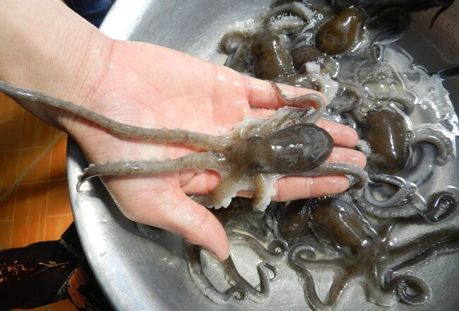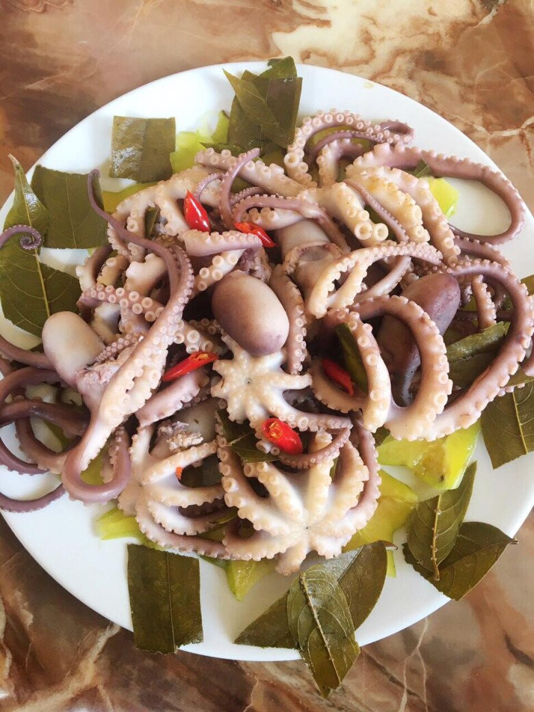 Một trong những món được dân sành ăn truyền tai nhau phải thử khi đến Quảng Ninh là ruốc lỗ luộc lá ổi. Sau khi làm sạch, ruốc được luộc cùng lá ổi, lá me chua và lá sả. Sự kết hợp độc đáo này không chỉ giúp khử mùi tanh mà còn khiến thịt ruốc săn chắc, thơm hơn. Khi chín, ruốc chuyển màu hồng phớt, xúc tu cong lại như những cánh hoa nở rộ, vừa đẹp mắt, vừa hấp dẫn vị giác.