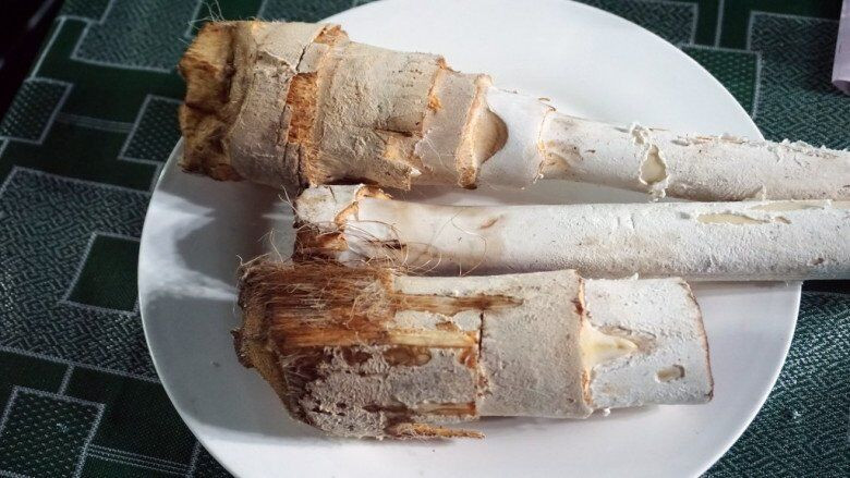 Anh Khánh cho biết, so với củ hũ dừa, củ hũ chà là thì củ hũ của đủng đỉnh có kích thước bé hơn nhiều. Muốn thu được cũ hũ, người ta sẽ chọn những cây đủng đỉnh trưởng thành, rồi chặt lấy phần ngọn, bóc hết các bẹ lá bên ngoài cho đến khi thấy phần trắng nõn ở bên trong. Đó chính là củ hũ. Khoảng 3-4 củ hũ đủng đỉnh mới được 1kg.