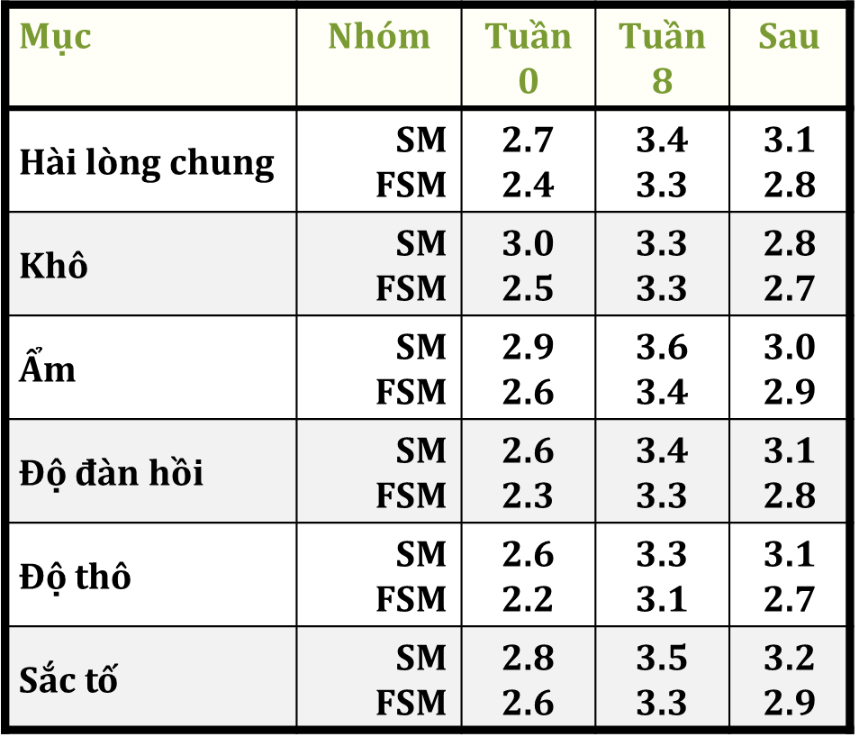 Ảnh hưởng của sữa đậu nành (SM) và sữa đậu nành lên men (FSM) đối với chỉ số hình thái ở nhóm phụ nữ sau mãn kinh, trong đó điểm cao nhất là 10 và thấp nhất là 2
