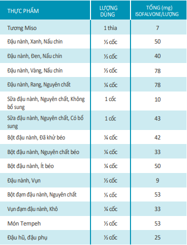 Hàm lượng isoflavones trong thực phẩm từ đậu nành trích từ Cơ sở dữ liệu dinh dưỡng của Bộ Nông nghiệp Hoa Kỳ