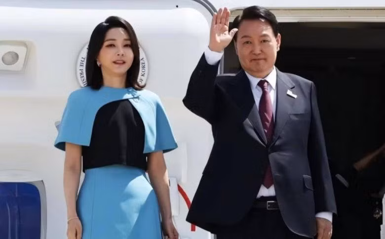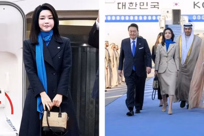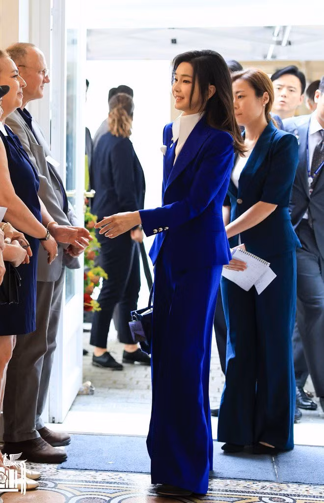Mỗi lần đi công tác cùng chồng bà Kim Keon Hee dường như luôn biến những chiến đi của mình thành những sàn diễn thời trang. Nhiều người hâm mộ phát hiện ra rằng có những chuyến không du, bà thay 2 - 3 trang phục mỗi ngày. Điều đáng chú ý là trong số rất nhiều trang phục, Đệ nhất phu nhân xứ Hàn dường như thể hiện sự yêu thích với màu xanh lam.