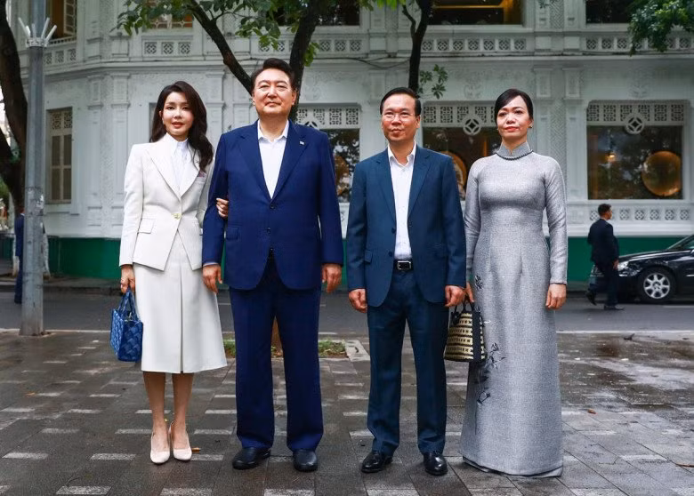 Hay tinh tế hơn, chỉ cần một chiếc túi xách màu xanh coban, Đệ nhất phu nhân 51 tuổi đã có thể trông nổi bật trên nền trang phục màu trắng thanh lịch lại có thể đồng điệu, ton sur ton bên Tổng thống Yoon Suk Yeol trong chuyến thăm Việt Nam mới đây. Được biết, chiếc túi này sau đó cũng đã nhanh chóng cháy hàng vì chị em nào cũng "ăn theo".