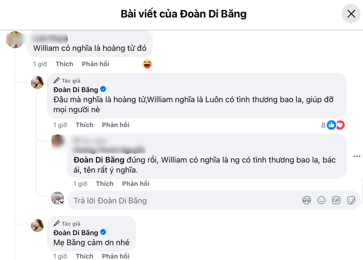 Dưới bài đăng, nhiều bạn bè đã dành lời khen ngợi cho cái tên mà phú bà quận 7 dự định đặt cho con trai. Một vài người bạn cho rằng William mang ý nghĩa là hoàng tử, tuy nhiên, Đoàn Di Băng đã nhanh chóng giải thích rằng “William nghĩa là luôn có tình thương bao la, giúp đỡ của mọi người”.
