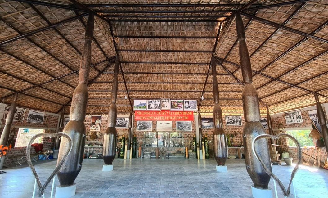 Ở dưới là các vỏ bom tấn, tạ. Càng lên cao, kích thước vỏ bom càng nhỏ dần. Phía trên, mái nhà được lợp bằng lá cọ vừa mộc mạc vừa mát mẻ.