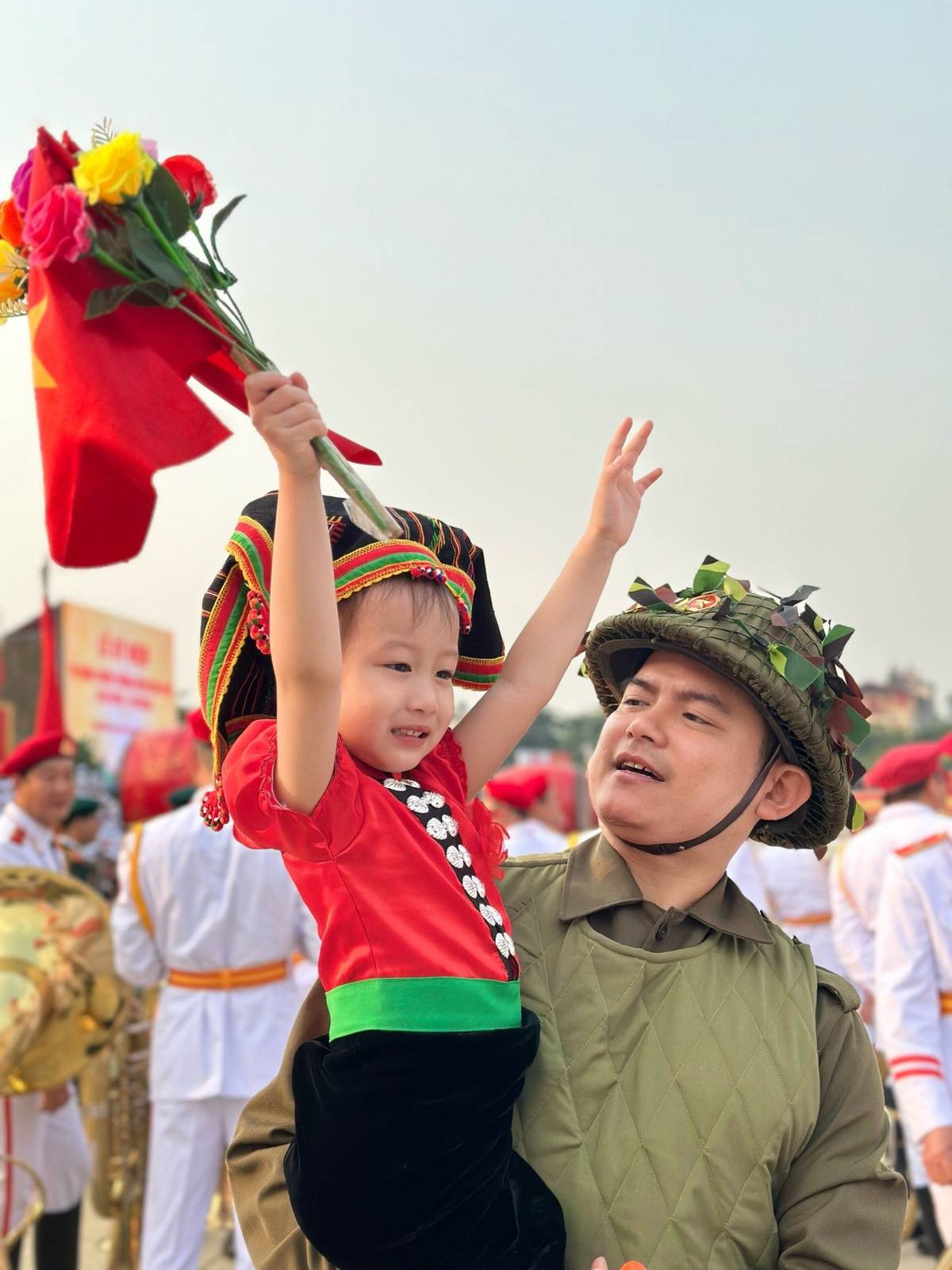 Cô bé hóa thân thành “Em bé Điện Biên” với vẻ ngoài trong trẻo, đáng yêu đã nhận về vô vàn lời khen. Dưới cơn mưa, bé gái trong trang phục dân tộc Thái được các chiến sĩ bộ đội bế trên vai, trong tay cầm bó hoa bên lá cờ Đảng, cờ Tổ Quốc khiến ai cũng xúc động, tự hào.