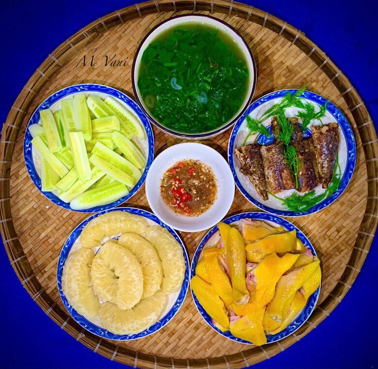 Gà ủ muối - Cá nục rán - Canh rau lang - Dưa leo - Bưởi.