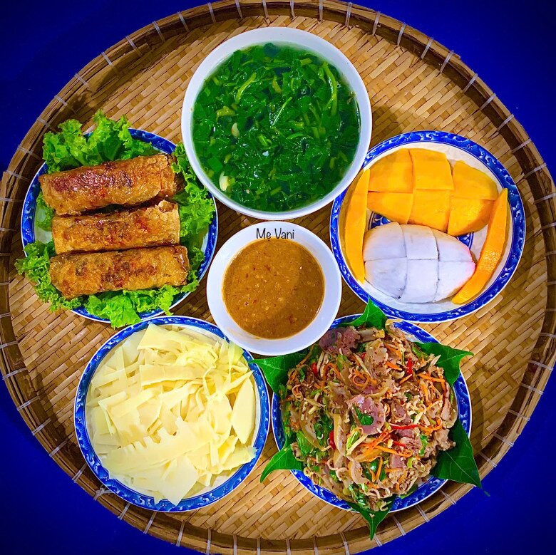 Nộm dê - Nem rán - Măng luộc - Canh rau muống - Xoài - thanh long.
