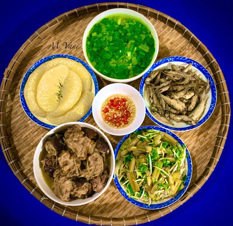 Cá linh chiên giòn - Chân giò giả cầy - Mùng muối - Canh cải ngọt - Bưởi.