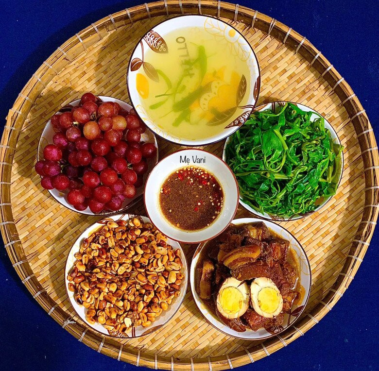 Lạc rim mật - Thịt kho - Rau muống luộc - Nho.