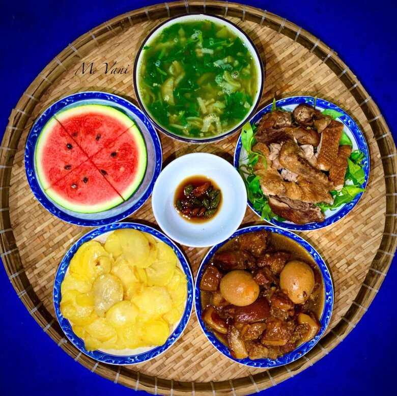 Thịt kho tàu- Khoai tây xào - Vịt quay - Canh cà - Dưa hấu.