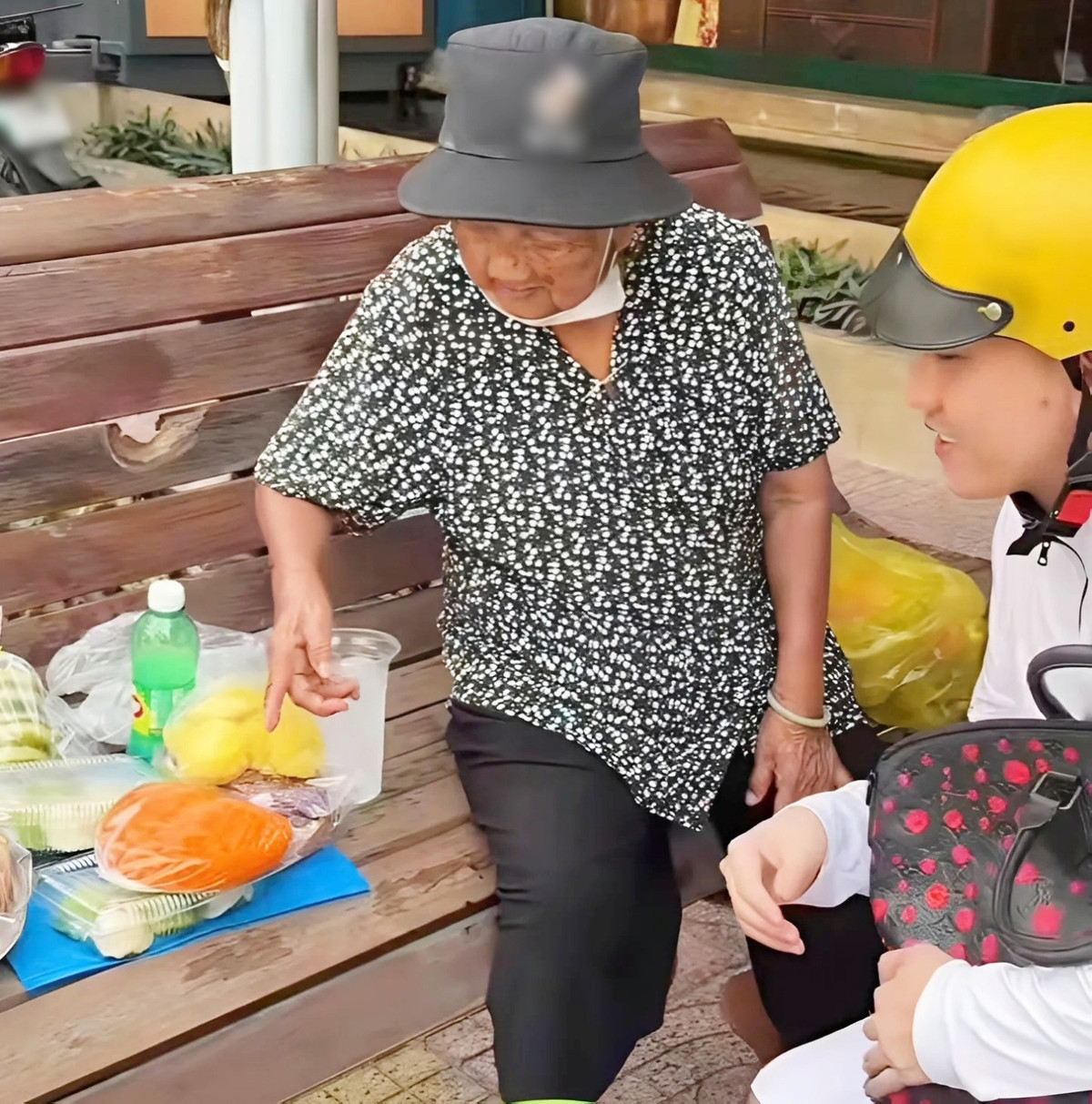 Ngay sau câu nói: “Ngoại ơi, con đói quá, ngoại cho con xin một cái bánh được không?”, cụ bà gật đầu đồng ý rồi hỏi chàng trai ăn bánh gì cứ lấy. Sợ ăn một cái không đủ no, bà tặng anh 5 chiếc, rồi kêu anh chọn bánh và lấy chiếc túi nilon đưa cho anh đựng bánh mang về.