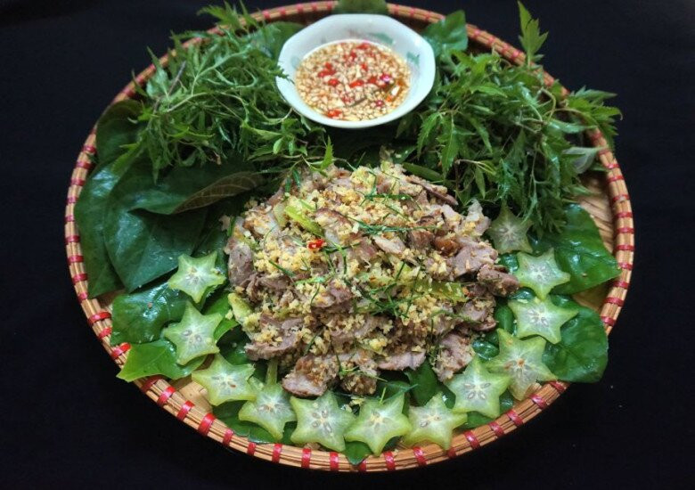 Thịt sau khi thái mỏng, trước hết đem bóp cùng với khế chua ở trên sao cho vị chua của khế ngấm vào thịt. Tiếp đến cho riềng đã giã nhỏ ở trên cùng vài lát ớt, chút gia vị nêm nếm cho vừa miệng. Cuối cùng rắc chút vừng, lá chanh và vài lát sả trộn đều là được.