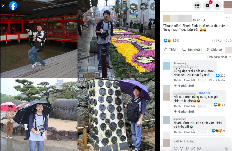 Theo đó, khi năm xưa đang còn là sinh viên, anh chàng trông khá ngố tàu với cặp kính cận. Nhìn vào những khoảnh khắc chụp trong ảnh ghép, có thể thấy vị Shark thời chưa "bể dáng" với chiếc bụng phệ rất vừa vặn với thiết kế quần jeans, áo thun cổ chui. Anh còn gắn liền với giày thể thao thương hiệu bình dân, đôi lúc đi sandals đen giản dị. Tấm ảnh đeo ba lô ngược ở trước ngực của vị Shark thời còn trẻ còn khiến nhiều người liên tưởng tới truyền thuyết của những anh chàng học trường đại học Bách Khoa quanh năm chỉ biết học và học.
