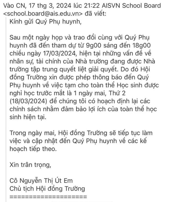 Email nêu rõ: "Sau một ngày họp và trao đổi cùng với quý phụ huynh đã đến tham dự từ 9h đến 18h ngày 17/3, hiện tại, những vấn đề về nhân sự, tài chính của nhà trường đang được nhà trường tập trung quyết liệt giải quyết. Do đó, hội đồng trường thông báo đến quý phụ huynh về việc tạm cho toàn thể học sinh được nghỉ học trước mắt 1 ngày mai, thứ hai (18/3/2024) để chúng tôi hoạch định lại các chính sách nhằm đảm bảo lợi ích của toàn thể học sinh hiện tại”.