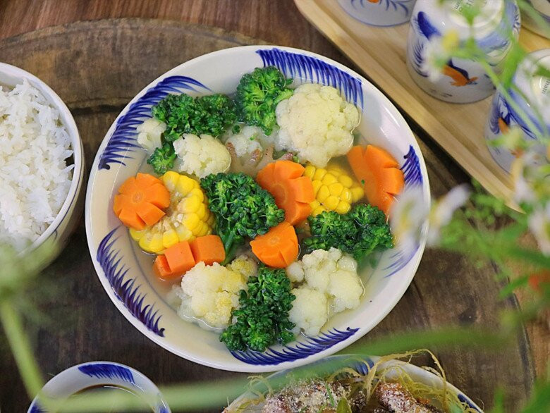 Xương gà hầm mềm với hành khô sau đó thêm súp lơ xanh và trắng đã rửa sạch và cắt miếng vừa ăn, ngô ngọt chặt miếng, cà rốt gọt vỏ rửa sạch cắt miếng nhỏ vào. Nêm muối vừa ăn. Nấu sôi ở lửa vừa 5 phút là được.